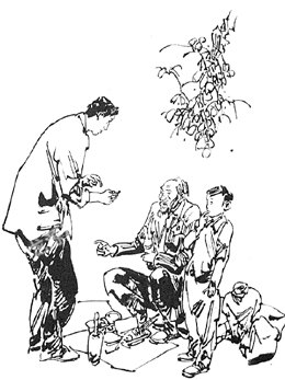沈定走呀跑呀,后来转过一个街角,看见几个小孩子,正围着一个老头,老头衣衫褴褛,头发凌乱,还莫名其妙地“嘻嘻哈哈”笑着。沈定上前驱散了那群孩子,摸摸口袋,见还有些钱,就到附近的小饭店买了两瓶老酒和一些下酒菜,然后坐在老头对面,让老头一起吃。老头也不客气,打开一瓶酒,一口气灌下半瓶,然后伸手抓起一只鸡腿,大口大口地吃了起来。沈定却吃不下,叹了口气,和老头唠叨起自己的伤来。老头也不说话,撸起沈定的袖子看了一下,对沈定说:“好办,伤口还不算大,我教你一个方子,包你一夜就好。”