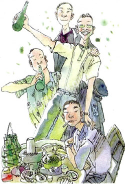 我一下来了劲,拉着他高声说:“什么话也不要说,走,到我们包厢喝酒去。我们几个铁哥们正在聚会,你也去认识认识!”