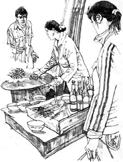 烤肉摊老板是位五十来岁的妇女,服务员叫小红,长相不差,话语不多,人很勤快,忙前跑后的总是一阵风。她对女老板一口一个姑妈的叫着,两个人亲得像一对母女。见包飞宇他们又来了,连忙笑脸相迎,很快拿来啤酒,端来烤肉。