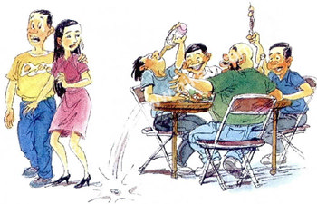 回家路上,他俩被一阵香味引入路边小巷。巷子里有个卖烧烤的,摆了两张小桌正在做生意,其中一张桌已经被四个喝啤酒的汉子占了,小章便要了几串铁板鱿鱼,和小莉坐上另一张桌子。