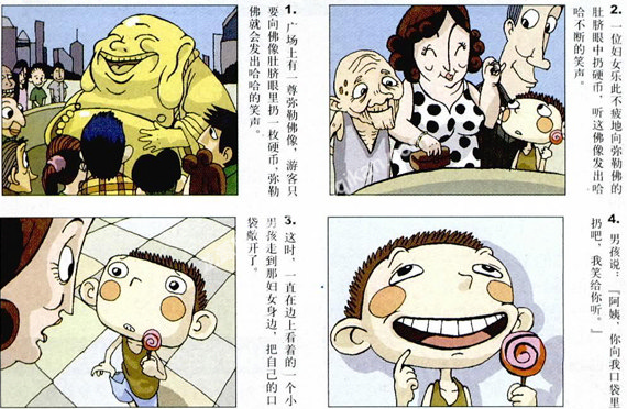 我笑给你听 广场上有一尊弥勒佛像,游客只要向佛像肚脐眼里扔一枚硬币,弥勒佛就会发出哈哈的笑声。 一位妇女乐此不疲地向弥勒佛的肚脐眼中扔硬币,听这佛像发出哈哈不断的笑声。 这时,一直在边上看着的一个小男孩走到那妇女身边,把自己的口袋敞开了。 男孩说:“阿姨,你向我口袋里扔吧,我笑给你听。”