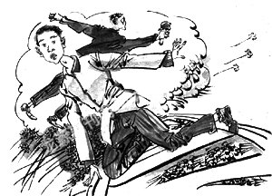 随着一阵刺耳的刹车声,火车终于在距离周涛几十米的地方停了下来,而火车头几乎快擦着了傻叔叔。周涛出了一身冷汗,他蹲下身来仔细一看,原来是鞋带缠在铁轨岔道里了,他赶忙一用力,把脚从鞋子里拔了出来。