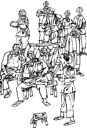 半上午,老欧召集村民来到场基上开会。他蹲在石磙上抽闷烟,见村民都到齐了,便将烟屁股往地上一砸,黑着脸硬邦邦地说:“开会!这几天,有人骂我不该躲起来,做缩头乌龟!好,我这就伸伸头,冒个泡!今儿掏井,得按我的方案办!我的方案绝对公平!大家姿态都要高一点,要是有人磨牙,我再也不管了!”