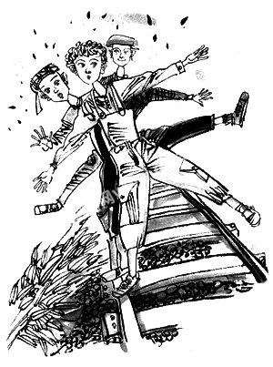 “这不可能!”孩子们都不相信他们的老师,于是约翰和杰克手牵手来到平行的铁轨边,各自踏上一条铁轨,手拉手,身体稍向外倾斜,靠伙伴的拉力保持着平衡。只见他们毫不费力地在铁轨上走着,平稳极了。