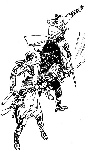 李妻一声惊叫,正在这时,只听“当”的一声锐响,李赫手中的剑突然脱手飞出,连同一枚五角棱镖一齐钉在木墙壁上。门口暗处,一人夺门而入,来的正是衙门的屈捕头。