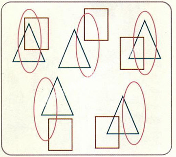 找不同 5组互相重叠的三角形、长方形和椭圆形画在图中。你能说出哪组与众不同吗?