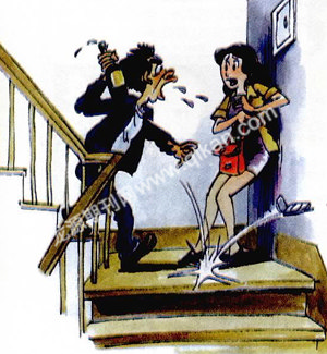 庞丽边唱边上了二楼,一抬头却发现前面横着一个手持木棍的陌生男人,只见此人瞪着血红的眼睛,流着哈喇子,面目狰狞。庞丽顿时被吓得愣住了,心想:天啊!这人我怎么不认识呢?难道是那个色狼?