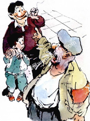 儿子刚想接话,只听前面有人大喊:“站住!”只见一位戴红袖章的老大爷气呼呼地冲过来,指着牛大哈严肃地说:“乱扔垃圾,罚款十元!”老大爷火气正旺,声音震天响。口水溅出来,长长短短地沾在胡子上。