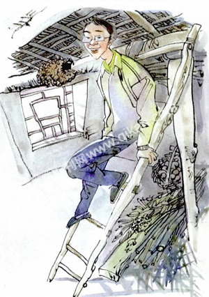 这真是一只奇怪的小燕子!龚明趁小蓝外出的机会,找来了一把木梯,把木梯搭在屋檐下的木梁上,他小心翼翼地爬上去,想探个究竟。