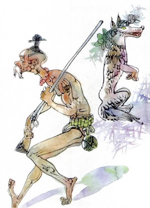 狼在森林里被猎人追杀,无处可逃之时,发现一顶用绿色枝条编织的草帽,忙将其戴在头上,蹲在草丛中。猎人没有发现戴着草帽的狼,继续向前追去。草帽让狼躲过一劫,于是,狼觉得草帽是救命的法宝,便将它带在身边。