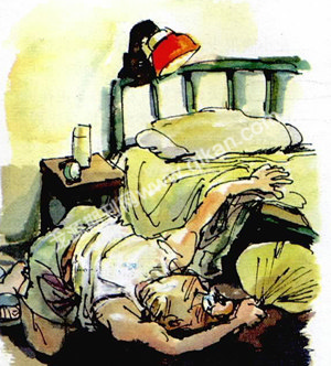 可不一会儿,“嗡嗡”声又来了,这回他可听得真真切切的,于是把灯一开,跳下床,从天花板到墙壁仔仔细细搜了一遍,再用蒲扇在床铺底下扇了几个来回,连蚊子的影子也没找着,只好摇摇头,上床睡觉。