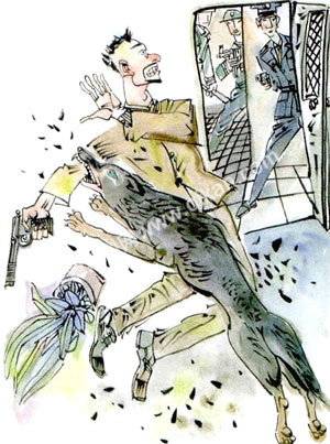 大甲准确地接收了老杜的指令,从犯罪嫌疑人身后的绿化带潜伏过去,绕到他的西侧,在他将要扣动扳机的节骨眼儿上,以迅雷不及掩耳之势扑了上去,一口咬住他那只擎着手枪的右手,顺势一甩头,将枪撸了下来。大甲后爪先落地,似乎还没停稳,就闪电般一扭身,飞身跃起,扑倒了那家伙,训练有素地用前爪死死按住了犯罪嫌疑人那两条有力的胳膊,龇着利齿对着他的喉咙狂吠不已,吓得那个杀人不眨眼的家伙连连求饶:“我投降了!别让狗咬我!”