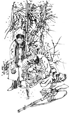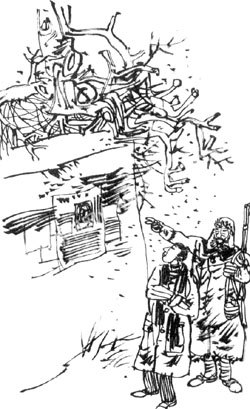 老冯头选好地点后,拿出了早已备好的“玉米棒子”,将头朝上插进雪地里,又从怀里掏出一个军用水壶,将壶中的水浇在“玉米棒子”旁边,转眼工夫,“玉米棒子”就被牢牢地冻在雪地上了。接着,叔侄两人走到下风头,选了个地方隐蔽起来,等待饿狼上钩。飘落的雪花,很快将他们的脚印覆盖了。