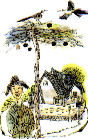 韩国北部的乡村公路边常常会有很多柿子园,金秋时节正是采摘柿子的季节,当地的农民常常会留一些成熟的柿子在树上,他们说,这是留给喜鹊的食物。
