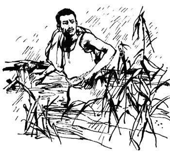 从小李村骑车到镇上本来十来分钟就够了,但现在大雨冲断了道路路基,只能步行。虽然不算远,可中间要过一条河,这几天河水猛涨,大水淹没了桥面。老李找了好一会才把桥的位置认出来,他试探着走了两步,河水就到了腰间,他吓了一跳,脚步一滑,身子就被大水冲倒了,他眼疾手快,一把抓住河边一丛荒草。刚好这时村里的老山头到河边找家里走失的猪,见老李这模样,大吃一惊,急忙寻了根粗些的树枝让老李拉着上来了。