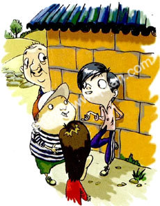正巧一个老汉从稻田里出来,小张想问老汉有没有看到他的榴莲,可又怕老汉不知道啥叫榴莲,于是便试探着问:“老伯,你有没有看到两个铁球?那家伙挺扎手的!”