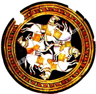 这是一幅有歧义的画,共有4个马头,每个马头可以有3个马身子与之相配。这幅画创作于17世纪的波斯。