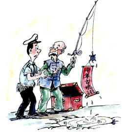 交警到场后,以不得阻碍交通为由,哄赶众人和老头。老头说:“交警同志,你能不能再等会儿?我要钓的这个东西,来头不小!”