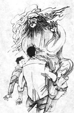 老雷小心翼翼地拔出了塞子,一股黑烟从瓶中缓缓冒出,那烟雾渐渐扩散、变幻、凝结,最后竟然变成了一个三丈多高、面目狰狞的巨人,老雷和小雷吓得魂飞魄散、瘫倒在地:“妖怪啊……”