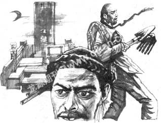 乱坟岗上阴风阵阵,王二到了岗上,定了定方位,来到了东南角上,找到了那座平头的土坟。他脚下草丛齐膝,“沙沙”作响,还有老鼠蛇虫之类窜来爬去,让人心惊肉跳!