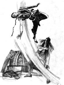 王二不敢将手伸进棺材去摸,他打着火折子,朝棺材一看,虽然早有心理准备,但火光一闪的刹那间,王二心里还是一阵狂跳:他看到了一张暗青色的死人脸,是一具男尸,看样子刚下葬不久,棺材内还没有腐烂的尸臭味儿。王二镇静了一下心神,跳进了棺材,单膝跪在尸体旁边,然后将怀中的绳子取出,绳子两端早已打好了两个圈。王二低下头来,把一个圈套在自己脖子上,一个圈套在死人的脖子上,接着,王二一挺身子,脖子上的绳套便带动尸体,尸体上半身斜竖了起来。