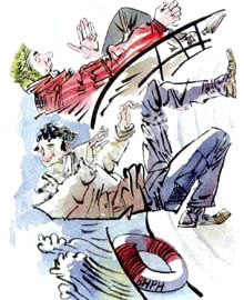 皮特里挣扎着浮出水面一看,不由倒抽了口凉气:好家伙,快艇已经头朝下扣了过去,“咕咕”地冒着气泡。皮特里被海水呛得直咳嗽,身体忽上忽下,随时都有可能被海水吞没,他奋力地划水,好不容易抓住倒扣的船底,这才暂时找回了平衡,他见鲁尼正抓着船底的另一头,气呼呼地问:“你这船是怎么开的?”
