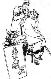 郝兵抬头一看,原来是个七十多岁、身穿旧式军人衬衣的瘦高个儿。瘦高个儿大声地嚷道:“张文才,果真是你在这里给人家解放军同志捣乱!你知不知道,还有很多人等着理发呢,你倒好,吃起独食来了!”