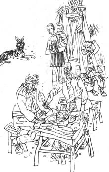 张老三依然笑着,正要回答,他老婆站在家门口喊他们回去喝酒。他们回到家里,他老婆已经在火塘边摆好了一张矮桌,桌子上八只大海碗里堆满了香喷喷的野猪野鸡兔儿肉,一只能装三斤苞谷酒的大锡壶,正在火塘里冒着喷香的酒气。