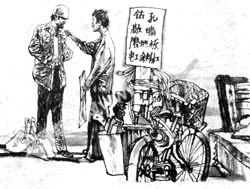 正说着,一辆小货车开来,斜眼马上歪着脑袋盯住。这时,不远处另一伙水猫儿也瞪起了眼睛,一个面前立着“电工”招牌的水猫儿看来是他们的头头,一见小货车也马上站了起来。
