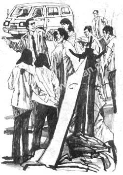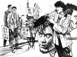 也许是出于职业习惯,大冯平时外出,总喜欢戴上墨镜,把头上的鸭舌帽压得低低的,遮住了大半个脸,今天也是如此。他开车到了立交桥下面,刚一下车,立刻被一群水猫儿围住,大冯赶紧说:“我要六个粉刷工,日工资四十元!”一个水猫儿挤上来,歪着脑袋讨价还价道:“四十太少,五十元!”大冯仔细看时,这家伙原来是个斜眼,只有偏着头才能正视。大冯觉得这姿态好像在哪里见到过,再听他说话又是大冯家乡的口音,不禁又好笑又同情,正想再给加五元,一个三十多岁的女人带着几个水猫儿挤上来,爽快地说:“四十元我们干!”说着就抬脚上车。斜眼一见急了,吆喝一声:“上!”几个水猫儿“噌噌噌”全拥上了车。大冯忙喊:“六个!多了不要!”可是车里已经上来了七个人,他们坐在车上谁也不肯动。