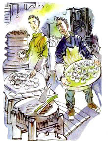 小六子早吓得没了主张,傻傻地站着发呆。老秦拿出旱烟杆,“吧嗒吧嗒”地吸了几口烟,对小六子说:“兔崽子,没啥好法子啦,加盐,把剩下的馅拌好!”小六子也知道没别的法子了,把剩下的一半包子做好,至少有一半人不会骂娘,他拌完了余下的馅,老秦用舌尖尝了尝,咸淡正好,于是小六子就眼泪汪汪地开始包包子。