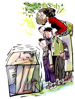 这时,我赶紧按麦克之前的吩咐,将他事先准备好的一块纸板拿了过来,等我转过纸板一看,顿时愣住了,纸板的正面画着一个夸张的孕妇肚子,并在子宫部位掏空成一个倒鸭梨状的洞,我把纸板放到玻璃柜前面,把倒鸭梨状的洞对准玻璃柜里蜷缩着的麦克,嗬,从讲台下往上一看,麦克就活灵活现地成了母体子宫里呈睡眠状态的足月胎儿了。刚才还在叽叽喳喳议论的孩子们全都哑了嘴,目不转睛地盯着玻璃柜里的麦克。
