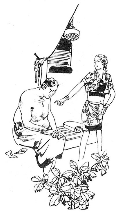 老秦随艳艳进了套间,套间里墙皮脱落,墙上贴着几张低俗的美人画,几只苍蝇“嗡嗡”乱飞,屋角放着张肮脏的双人床,散发着浓浓的霉臭味。艳艳插上了套间门,哼着小曲扭到老秦面前,轻轻地把他往床上推。老秦没吃这套,皱着眉,板着脸,掩着鼻子坐到桌边一张折椅上,先拿出200块钱扔到桌上,对艳艳威严地说道:“你坐下,我有话对你说!”