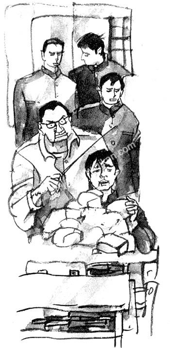 山下战战兢兢地坐在了大算盘上。算盘珠的锐角毫不留情地扎进了山下的大腿肌肉里。其间,由于疼痛难挨,山下曾活动过几次大腿,立刻便遭到筱原的责骂。山下紧咬着嘴唇,脸色苍白地忍受着痛苦的煎熬。