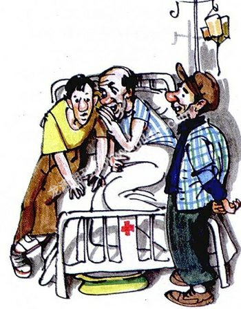 老李把脸一沉说道:“混账!这是什么话?你爸的棋艺越来越高深莫测了。这不,今天老张都被我的棋艺逼得犯了老病,进医院输液了!”说着伸手指着躺在急救室病床上的老张。