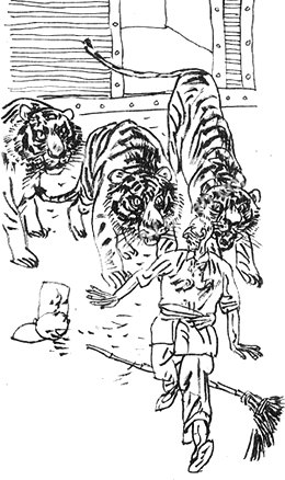 前天,饲养员把老虎赶到另一个密闭的屋子里喂食,他爹赶紧抽空去笼里一根一根地收集虎毛,不料,那扇通往喂食屋子插得牢牢的小门,不知是何原因竟意外地开了,三只老虎窜回到笼里,看到他爹,扑上去一阵撕咬,等到采取措施的时候,一切都已经晚了……