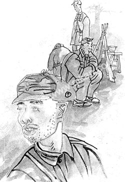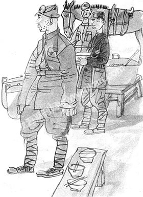 二人来到饭场,雪地上排着长长的队。一个士兵对打饭的人说:“营副,再添点盐水吧,你看米饭都拌不湿。”那个营副说:“现在是抗战时期,物资艰难,你还想怎么样?想吃好的上军部去,小子,就怕你没那个造化。”那个士兵红着脸把饭一口一口地吞了下去,嘴里埋怨着:“吃这种饭还能打仗?命都顾不住。”