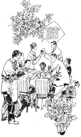 朱五受宠若惊地拿起杯子,一仰头一杯酒倒进了肚里,直呛得他嗓子火辣辣的,朱五只得从面前的盘子里,连夹了几口菜压一压。新媳妇也随手抄起筷子,从那只盘子里夹菜,吃了起来,见大家都还木呆呆地不动弹,就笑着招呼起来:“大家还客气个啥?喝酒吃菜呀!”