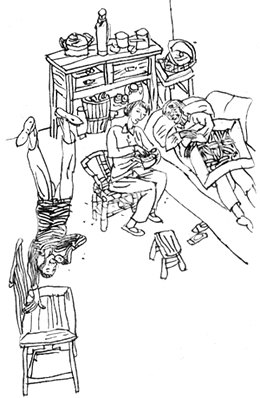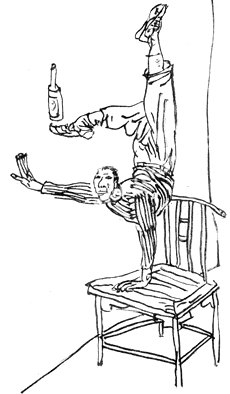张宏亮透过窗子朝屋里看,只见一个人打了个后空翻,倒立起来,再一细看,这不是赵江波吗?只见他倒立着挪到摆着饭菜的凳子前,一手撑地,另一只手拿起筷子,吃起饭来。一边吃着,一边说:“妈,您瞧我已经吃掉半碗了,你也快吃吧。”