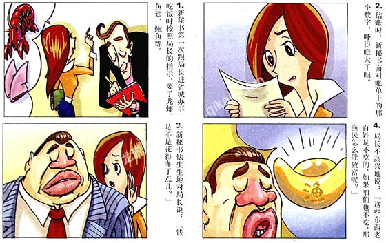 为了渔民致富 (文:张妍;图:包丰一) 1.新秘书第一次跟局长进省城办事,吃饭时按照局长的指示,要了龙虾、鱼翅、鲍鱼等。 2.结账时,新秘书面对账单上的那个数字,吓得瞪大了眼。 3.新秘书怯生生地对局长说:“钱是不是花得多了点儿?” 4.局长不高兴地说:“这些东西老百姓是不吃的,如果咱们也不吃,那渔民怎么能致富呢?”