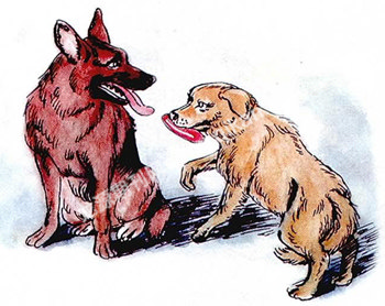 杨迪见老黄狗叼着猪尾巴不吃,觉着纳闷,正在这时,德山家到了,只听见院子里响起了一阵狗叫声,紧接着,从院门里蹿出了一条德国纯种的大狼狗,那狗真凶,吓得杨迪连连后退,这当儿,奇事来了,只见杨老根身后的老黄狗急忙跑了出来,把嘴里叼着的那根猪尾巴“献”给了大狼狗,大狼狗见到猪尾巴,立马就没了脾气,一口叼住,跑到狗窝边享用去了。
