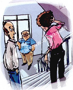 到了下午,小张和小王实在憋不住了,便想到楼道里偷着吸两口。谁知刚走下楼梯,就发现主任站在楼梯窗户前。两人只好尴尬地向主任打招呼:“您好,主任。”