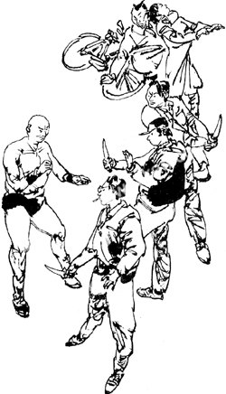黄毛话音未落,三个坏小子就拿着刀把光头汉子围了起来,正准备动手,只见光头汉子突然摆着手大喊起来:“慢慢慢!你们可不能这样对我下手啊!我被你们扎几下不要紧,可扎坏了我这套西服就惨了,”说着把身上的西装扒了下来,嘴里咕哝着,“这可是我结婚时花一千五买的。我救这位女士,才得她一千元,可我的西服要是扎坏了,我不是还得倒赔五百元?这赔本的买卖我可不干,要动刀子,等我先把西服脱了再说,反正你们要捅的是我,又不是我身上的西服,你们说对不对……”