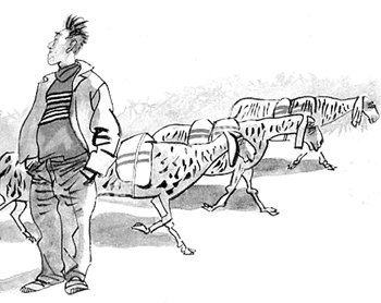 第二天,老人运来几车草料堆放在备料场上,又赶来四百多只高大威猛的小尾寒羊。老人背着一个大麻袋,里面全是一米五左右长的绳子和编织袋。老人把水泥、沙子装进编织袋内,一头拴上砖,一头拴上一个编织袋,将绳子搭到羊背上,浩浩荡荡地向泰山出发了。这些羊都是爬山的能手,驮上这些东西根本算不了什么,一边悠闲地吃着路旁的青草,一边爬山。老人日出而作,日落而归,晚上让羊群在备料场吃草休息,不出二十天就将所需的建筑材料全部运到山上。杨树德提前完成了工程,老人也狠赚了一笔运费。