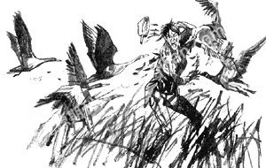 一会儿,混儿张在距大雁一二十米的地方潜伏下来,很从容地掏出竹筒、纸闷儿,能去除人味儿的野艾水洗也洗了,喝也喝了,再不用担心什么了,混儿张施展和溜儿王一般的伎俩,全神贯注地对付雁群的“哨兵”……