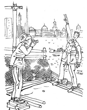 张树国小心翼翼地将身子探到外面,拍了几张以对面楼群为背景的相片后,还不满足,又想拍几张以下面的黄浦江为背景的。这需要从上往下拍,为了选好角度,同时避开铁架子,张树国就踩着铁管,尽量下蹲、外探,然后就问:“可以照到江面了吗?”