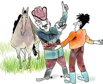 主持人问巴烟老汉是如何在二十秒内数完马匹的。巴烟老汉高兴地举起手里的相机说:“我就是用这个宝贝,数马相机数马就是快!只要一按按钮,草地上的马就都照进来了,连天上的飞鸟都数得清!”