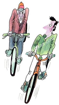 骑了半天,小飞的面前出现了一片湖水。眼看追兵将至,小飞急急地扔了自行车,跳进湖里拼命游。游了一会儿,小飞偷偷回头看,那失主竟也扔了车,扑通跳进了湖里。小飞傻眼了,只好硬着头皮,继续朝前游。