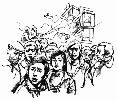 忙了一宿,他俩肚子都饿了,便手搀着手去街上吃早点。谁知,他俩出了大楼,身后便传来了一声巨响,就像炸弹爆炸,又闷又沉,接着就是“噼里啪啦”的玻璃落地声,又脆又响。小两口赶紧回头,只见熊熊大火从他们3号楼201室窗户蹿出来,自己301室的窗玻璃已被震碎,碎玻璃被大红喜字的红纸粘住,悬在了半空。