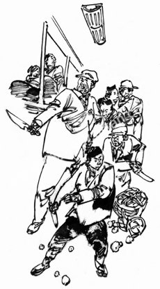 我一下子吓醒了,二大爷把车停住,猛地拉开车门,紧接着,把车里的灯也全打开了。冷风“嗖”的一声灌满了车厢,车里一下子亮如白昼,全车人都醒了。只见车子后面的过道上站着高高矮矮的六个人,脸上都蒙着面罩,每人手里都拿着一把或长或短的刀。